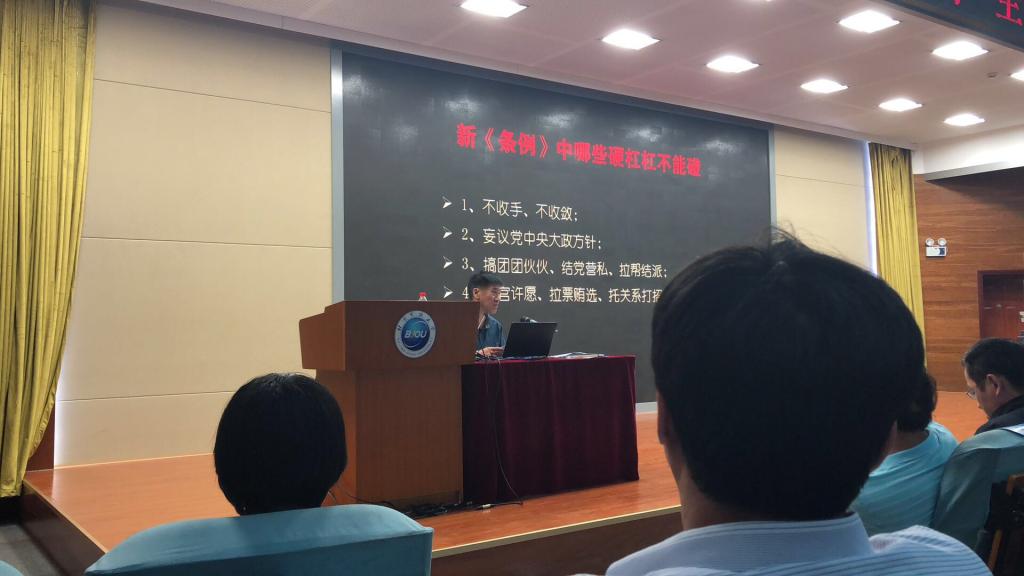 2018年9月26日上午,世界杯官网召开全体党员大会,深入学习新修订的《中国共产党纪律处分条例》。党委书记黄先开出席会议并讲话。党委副书记邵长生围绕主题,从条例修订的意义、新条例的特点、主要修订内容、需重点注意的问题等方面进行了详细阐释,要求各党支部要抓好抓实《条例》的学习,严格纪律约束。