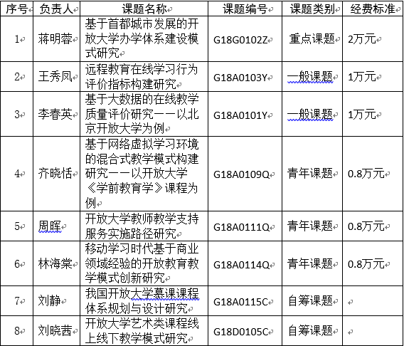 近日,国家开放大学印发《关于国家开放大学分部2018年度科研课题立项的通知》,世界杯官网有8项课题获批立项,其中重点课题1项、一般课题2项、青年课题3项、自筹课题2项,特向8位课题负责人及课题组表示祝贺。国家开放大学科研课题每两年申报1次,世界杯官网本次获批课题较2016年上涨了60%。