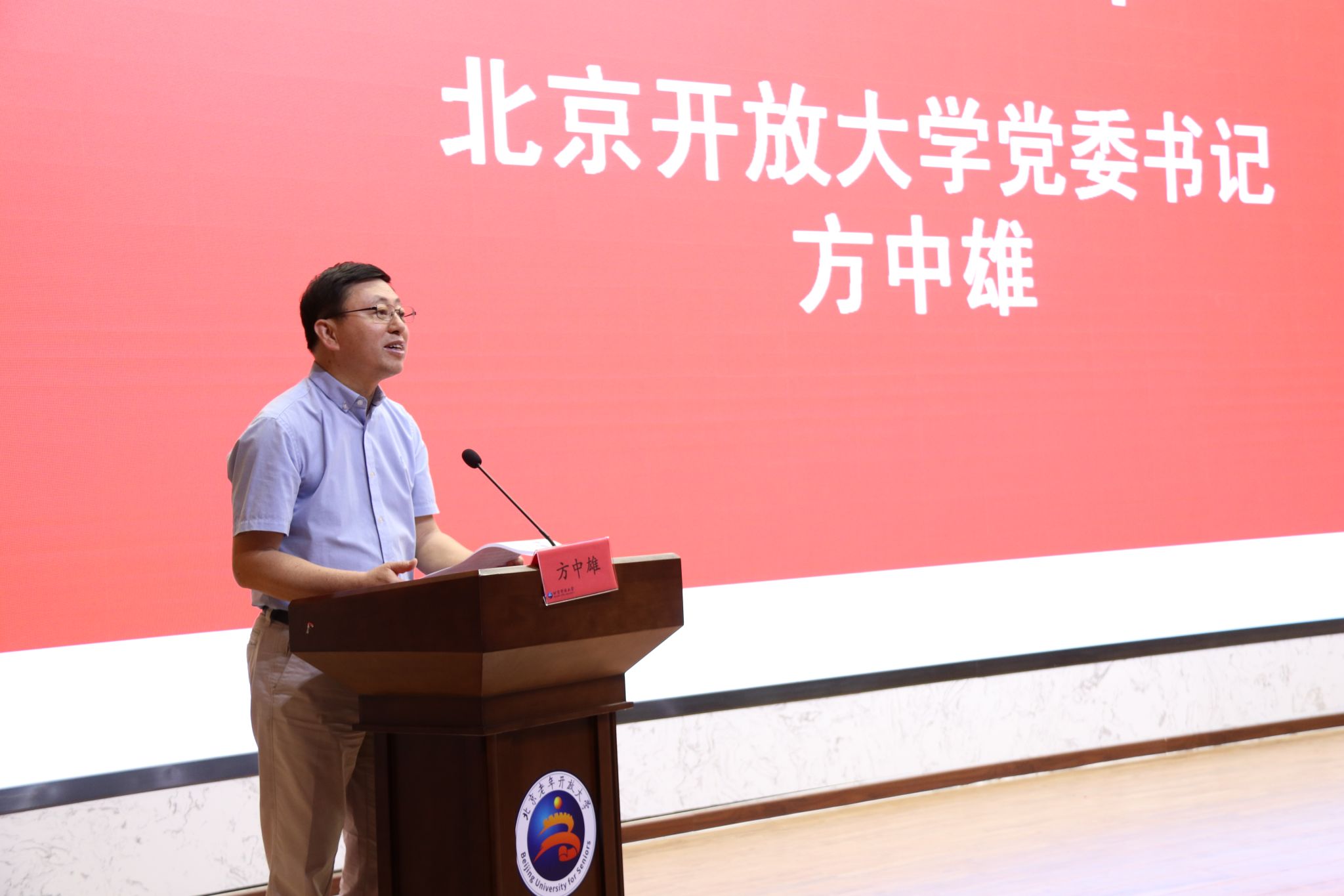 5月18日下午,“学养京城 情暖夕阳”系列公益直(录)播课程活动在西直门校区报告厅正式启动。学校党委书记方中雄、国家开放大学(国家老年大学)党委副书记刘臣、北京市老龄协会协调督查处处长袁刚、市教委职成处二级调研员陈敬文、国家开放大学老年学院副院长刘小楠、北京市养老服务事务中心副主任姜国辉、北京市军休安置事务中心三级调研员朱发福等领导出席了活动仪式。