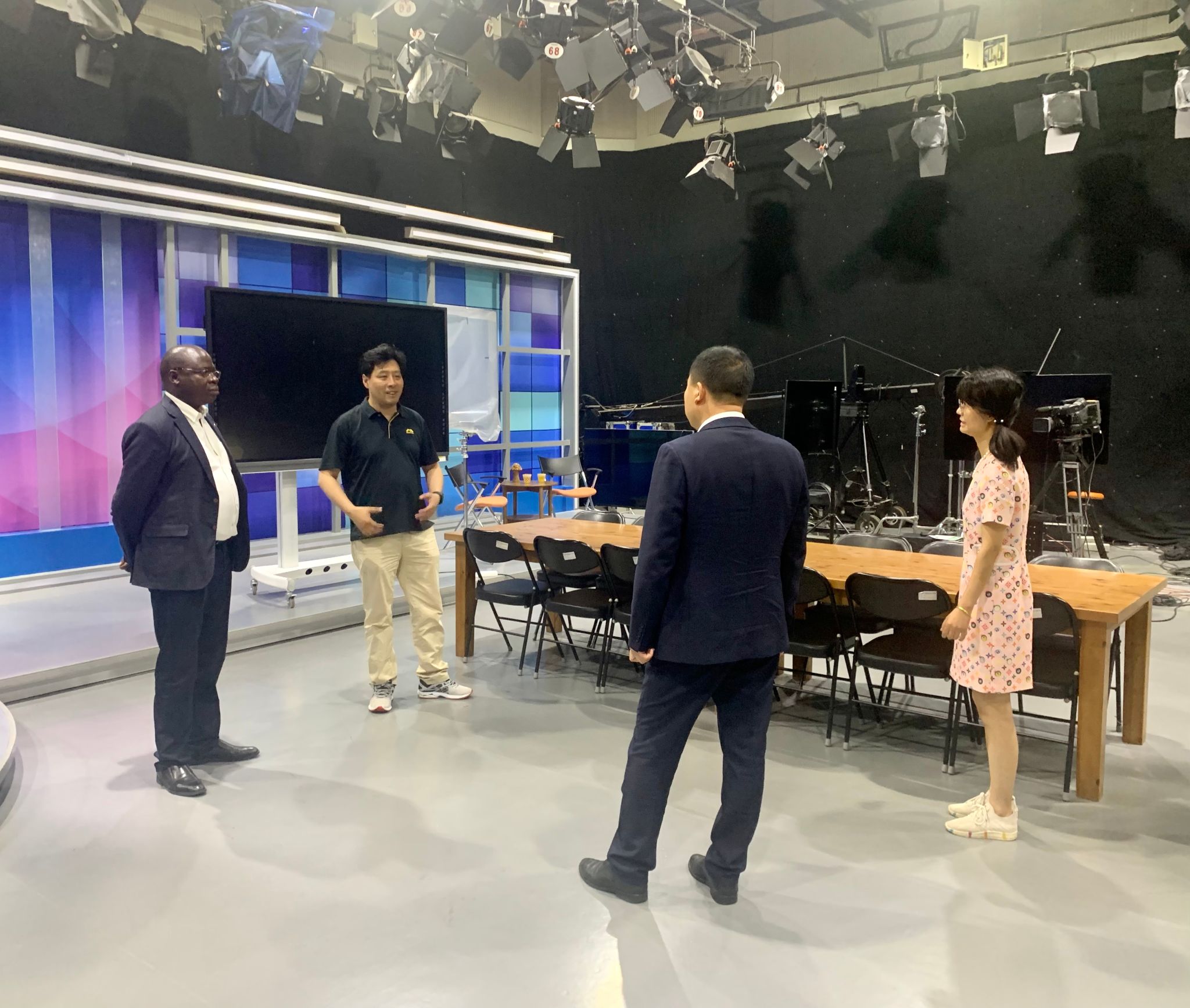 座谈会后,学校数字资源中心工作人员陪同外宾参观了演播室、图书馆。