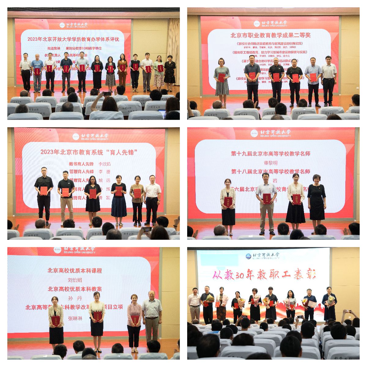 会上,为教龄满30年教职工颁发了证书,并对学历教育办学体系评优、北京市职业教育教学成果奖、北京高校优质本科课程、北京高校优质本科教案、北京高等教育本科教学改革创新项目立项、北京市教育系统育人先锋、北京市高等学校教学名师、青年教学名师等获得教师进行了表彰。
