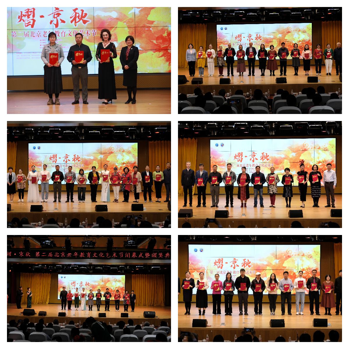 活动现场为“熠·京秋”第二届北京老年教育文化艺术节的339份获奖作品和66家获奖单位颁奖。