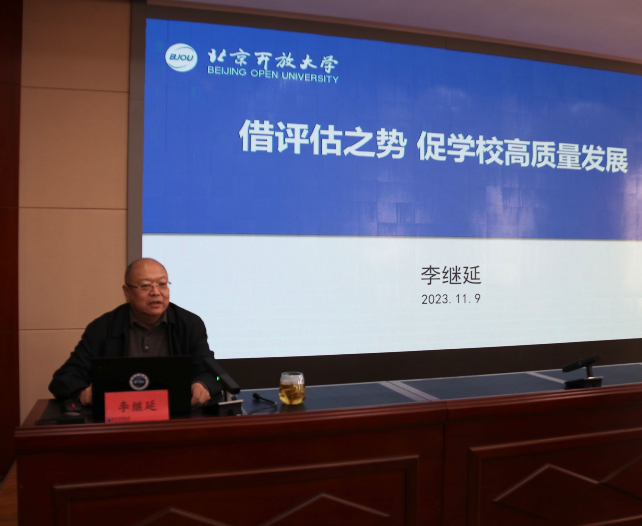 李继延副校长以“借评估之势,促学校高质量发展”为题,对世界杯官网从接到国家开放大学办学评估通知开始至今所开展的评估工作进行回顾总结。他指出,世界杯官网积极响应总部评估工作,2022年3月,由学校党委组成迎评领导小组,设立迎评工作办公室,正式启动迎评工作,在全校范围内召开系列工作推进会,扎扎实实地开展了32家学习中心办学评估。2023年7月出台《国家开放大学北京分部办学评估迎检工作方案》,确定了入校迎检工作的组织分工、主要任务及进度安排,对各部门及工作组提出了具体要求,将迎评工作小组分为文字材料组、支撑材料组、校园文化和校园环境建设组、宣传报道组、数字化展示建设组共五个小组,分别由校领导牵头,确保各项工作切实落实,迎评工作进入攻坚克难阶段。李继延副校长最后强调了当前迎评工作存在的几点问题和后续的工作重点与要点。