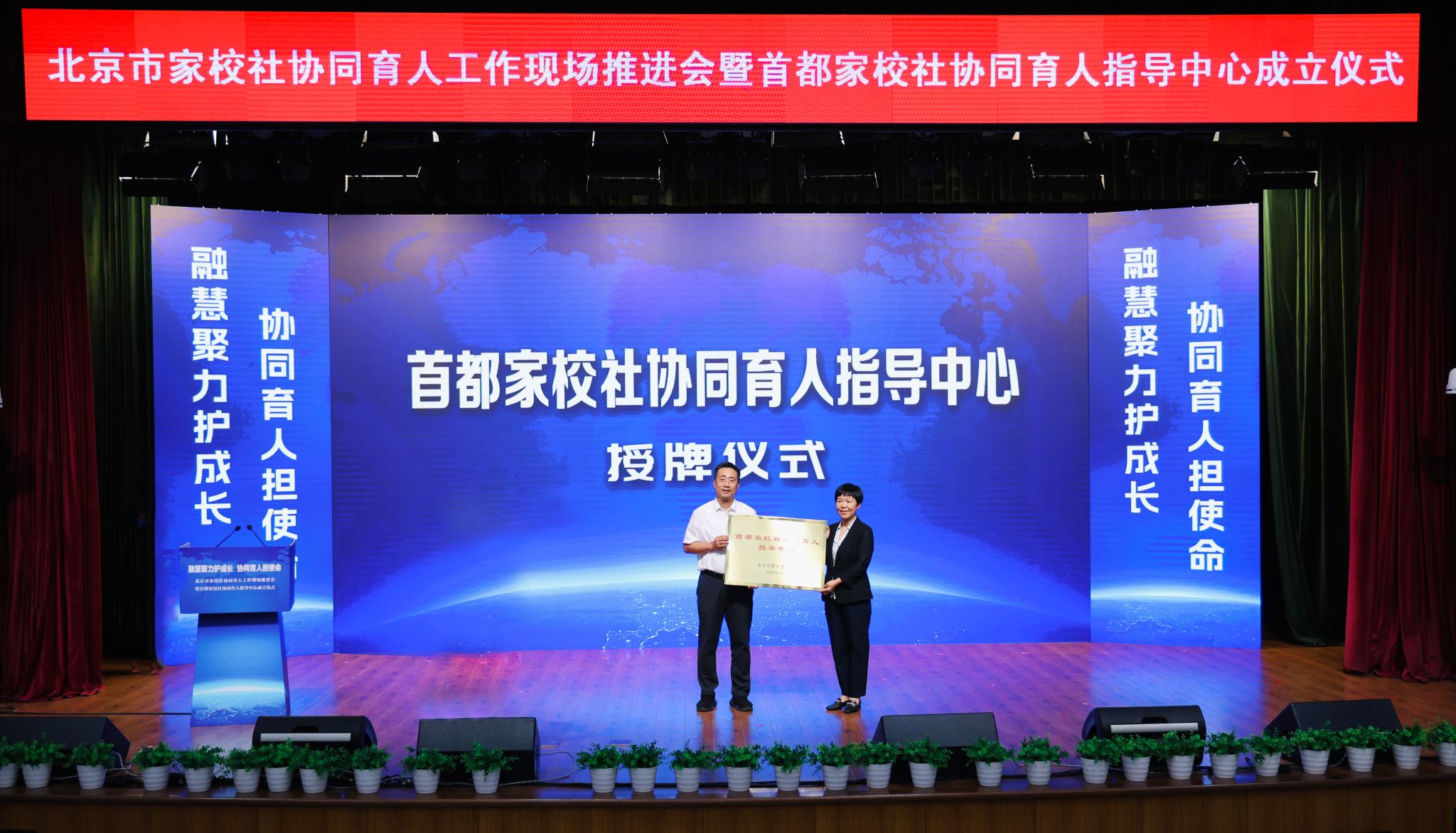 授牌仪式上,北京市教委副主任王攀为首都家校社协同育人指导中心授牌,2026世界杯官方合作网站党委委员、副校长赵军代表学校接牌。