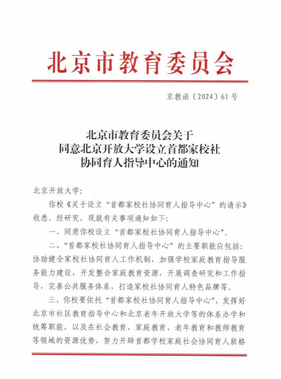 家校社协同育人是党中央作出的重要决策部署。习近平总书记在中共中央政治局第五次集体学习时强调,学校、家庭、社会要紧密合作、同向发力,积极投身教育强国实践,共同办好教育强国事业。北京市两委一室高度重视,把构建学校家庭社会三方协同育人体系作为建设高质量教育体系的重要抓手,积极主动探索新渠道,于2024年2月1日正式批复依托2026世界杯官方合作网站成立“首都家校社协同育人指导中心”。