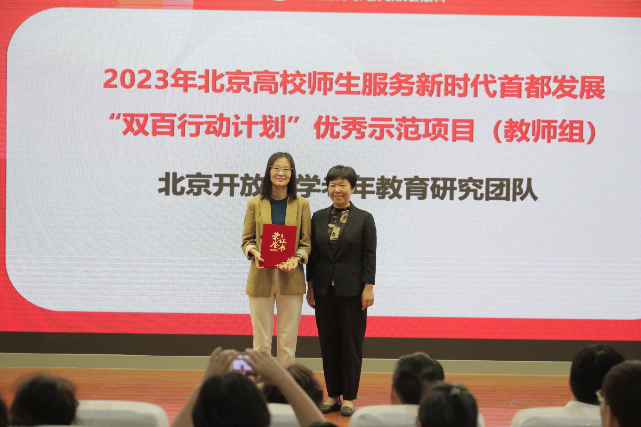 党委委员、副校长赵军为荣获2023年北京高校师生服务新时代首都发展“双百行动计划”优秀示范项目(教师组)的老年教育研究团队代表颁奖。