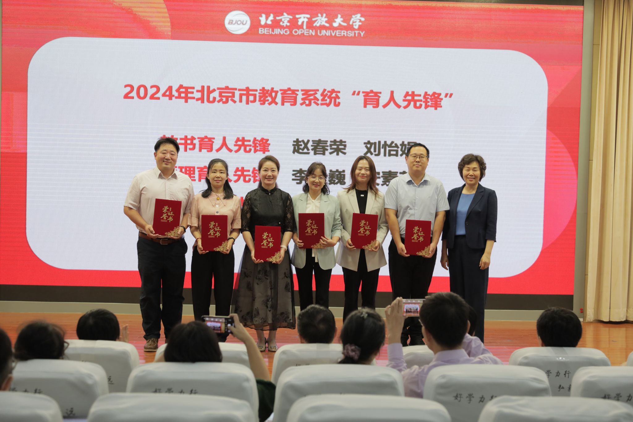 党委副书记、校长许晓革为荣获北京市教育系统“教书育人先锋”赵春荣、刘怡娟,荣获“管理育人先锋”李云巍、安素芳,荣获“服务育人先锋”路建胜、刘丽佳颁奖。