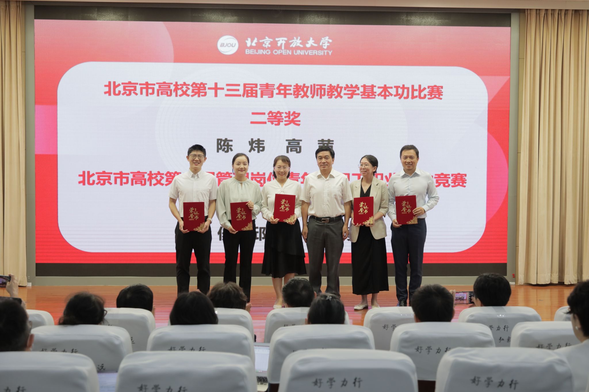 党委委员、纪委书记周启柏为荣获北京高校第十三届青年教师教学基本功比赛二等奖的陈炜、高茜,荣获北京高校第二届管理岗位青年教职工职业能力竞赛二等奖的邢俊、邱婕、谭智勇颁奖。
