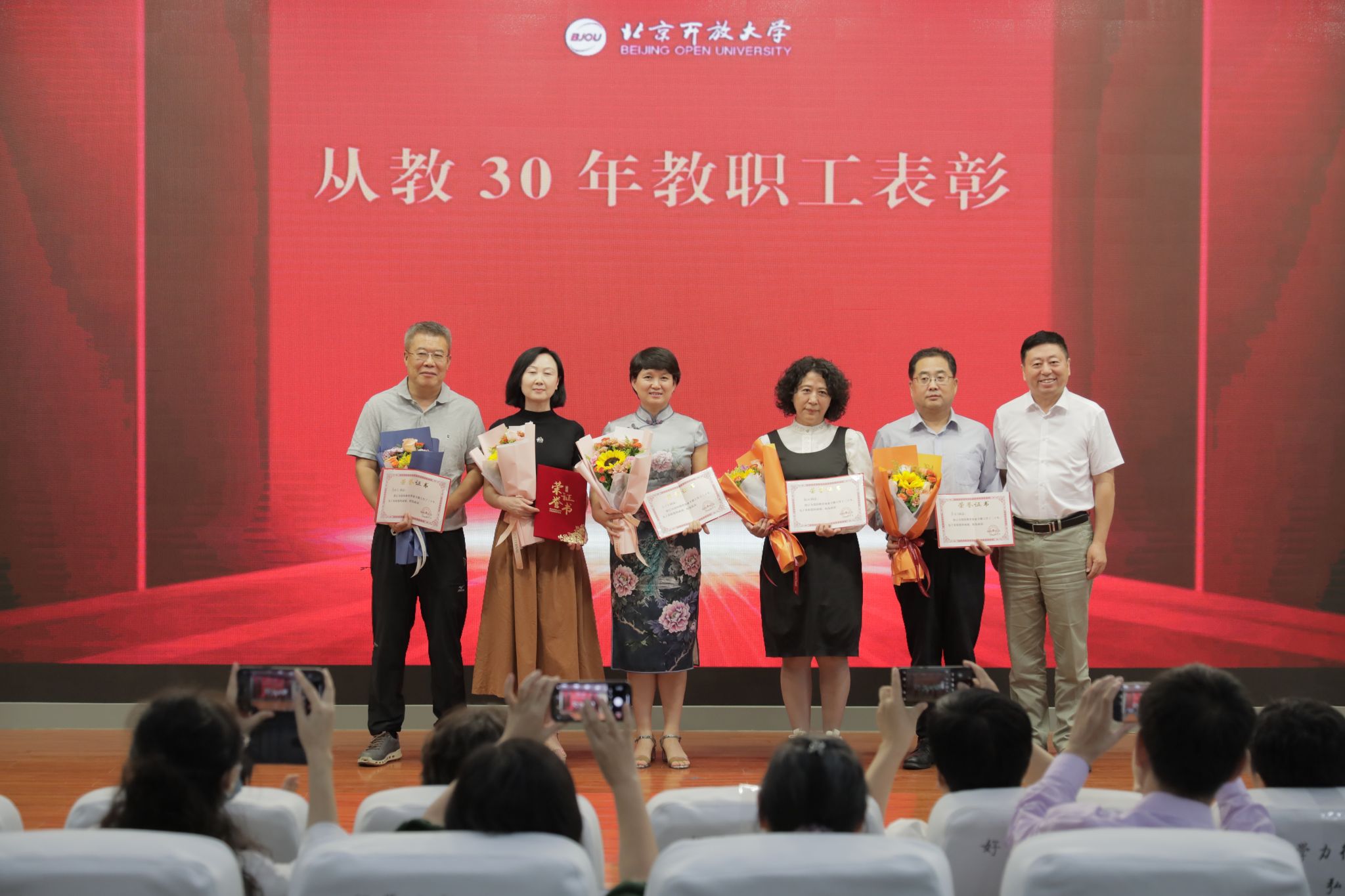 党委书记方中雄为从事教育工作满三十年教师孙月亚、蔡晓东、魏敏、白静、李继先颁奖。