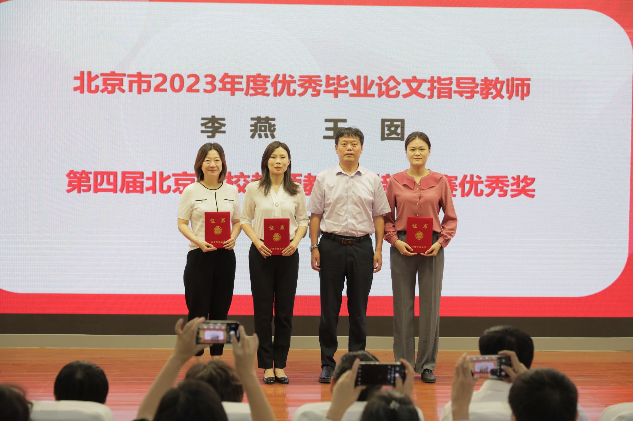 副校长徐志立为荣获北京市2023年度优秀毕业论文指导教师的李燕、王囡,荣获第四届北京高校教师教学创新大赛优秀奖的王新洁颁奖。