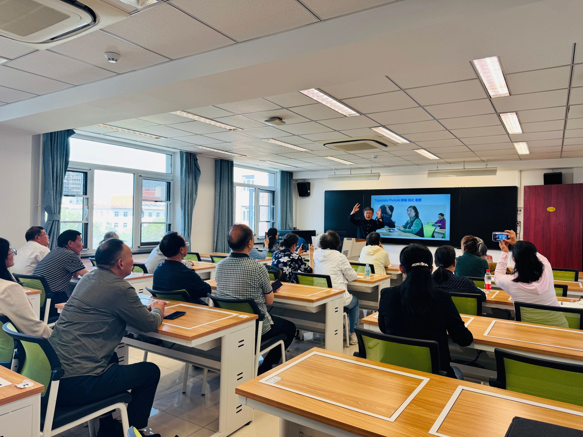 考察团首先走进《玩转智能工具 享受智慧生活》老年大学课堂,沉浸式体验人工智能与摄影相结合的双师教学场景。课堂上,张洪波老师为学员们讲解了摄影构图等基本理论与方法,史森老师则带领大家解锁了将人工智能豆包软件运用于影像创作新技能,使得老年人能够跨越数字鸿沟,紧跟时代步伐,学习并掌握互动设备学习手机摄影、AI处理照片等实用技能,生动展现了“科技助老”的创新教学模式。课堂上,考察团认真跟随老师教学,纷纷尝试使用人工智能制作生成摄影作品,跟随学员一起感受人工智能给生活带来的巨大便利。