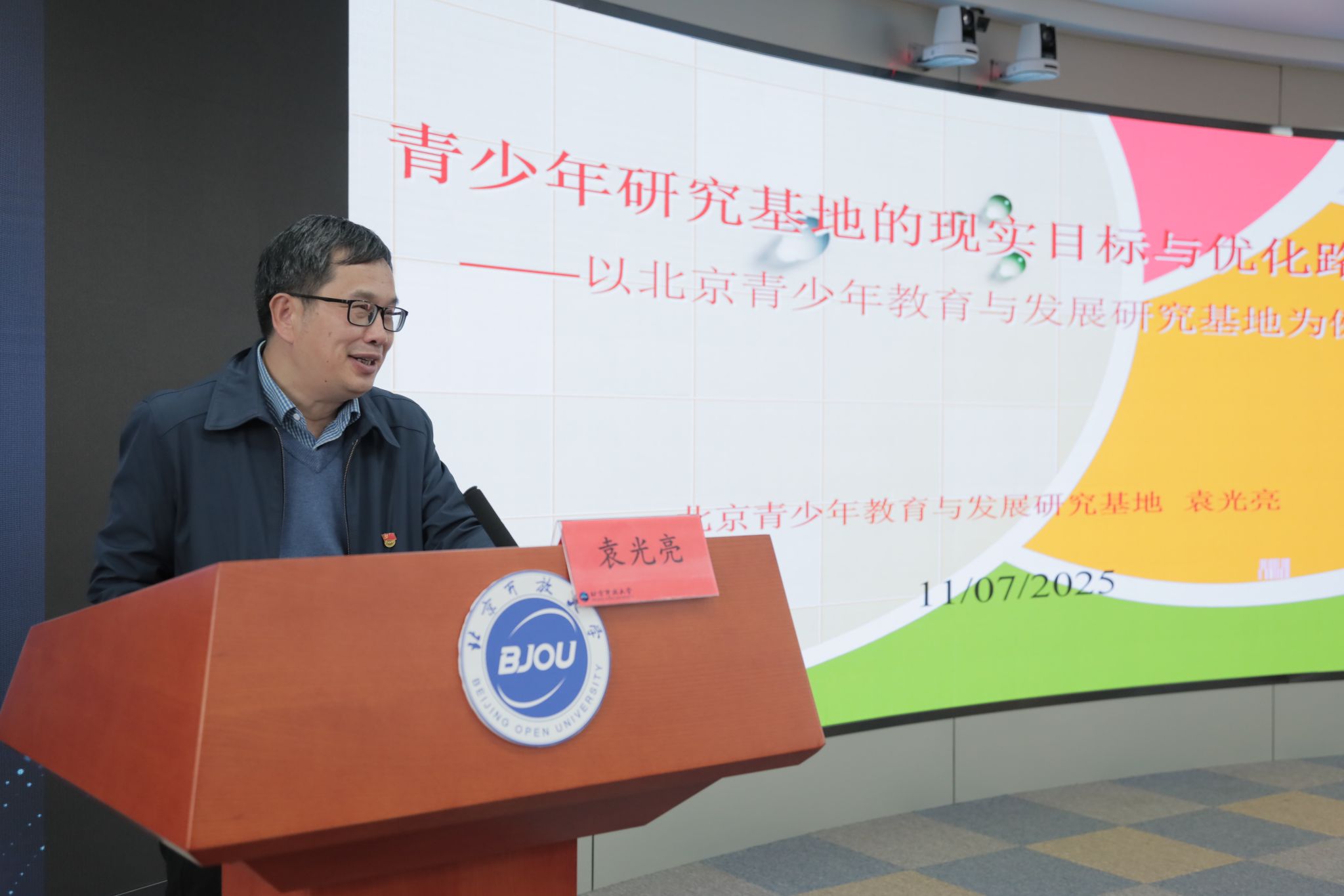 北京青年政治学院北京青少年教育与发展研究基地袁光亮教授重点介绍了基地如何围绕青少年社会热点问题、教育与发展等研究方向,通过设置科研贡献奖、完善评价机制等措施激发研究人员积极性,并在决策咨询服务方面取得显著成效。