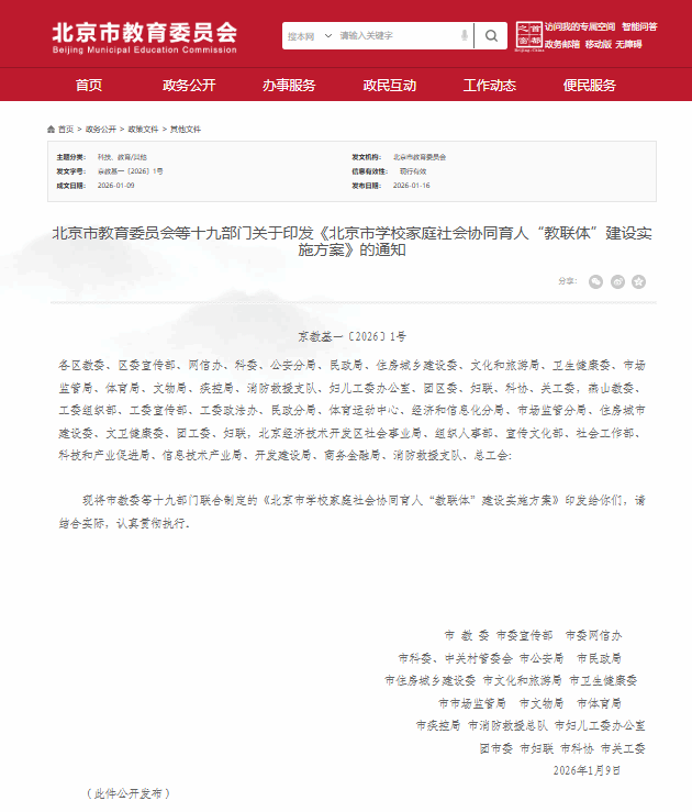 近日,北京市教育委员会等十九部门联合印发《北京市学校家庭社会协同育人“教联体”建设实施方案》,为全市协同育人工作绘制了系统路线图。方案明确将“建强首都校家社协同育人指导中心”列为一项重要任务,旨在将其打造为汇聚专业智慧、提供科学指导的核心枢纽。这标志着自2024年6月2026世界杯官方合作网站(首都校家社协同育人指导中心)揭牌成立以来,其作为市级统筹平台的战略地位与功能作用得到进一步强化和制度化明确。