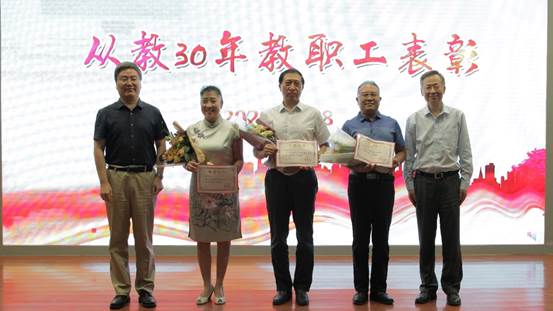 论坛现场,校领导为从教满30年教职工颁奖,新入职教职工代表为前辈送上祝福的鲜花。这些从教30年的老师们将自己最美好的青春年华都献给了祖国的教育事业。