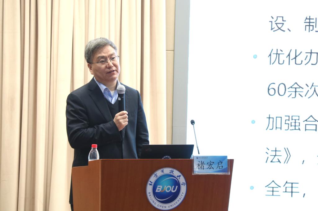 褚宏启部署下一步工作时指出,学校要全面贯彻落实党的十九届五中全会精神,把握新发展阶段,贯彻新发展理念,构建新发展格局,推动高质量发展。要紧紧围绕首都“四个中心”功能定位,在构建全民终身教育体系和服务学习型城市建设中,发挥不可替代的作用。2021年,学校要以高质量发展为主线,以深化改革为动力,继续坚持“规模、规范、有序、有效”工作总要求,全面实施“1322”工程,加快推进开放教育现代化。一要推进学历与非学历教育优质化发展;二要推进招生与办学体系规模化发展;三要推进教学、管理的信息化水平和学分银行建设;四要加强校本研究,实现理性化发展;五要扩大国际合作与交流,推进国际化发展;六要推进教师队伍和干部队伍专业化发展;七要加强党建,推进内部治理制度化建设。