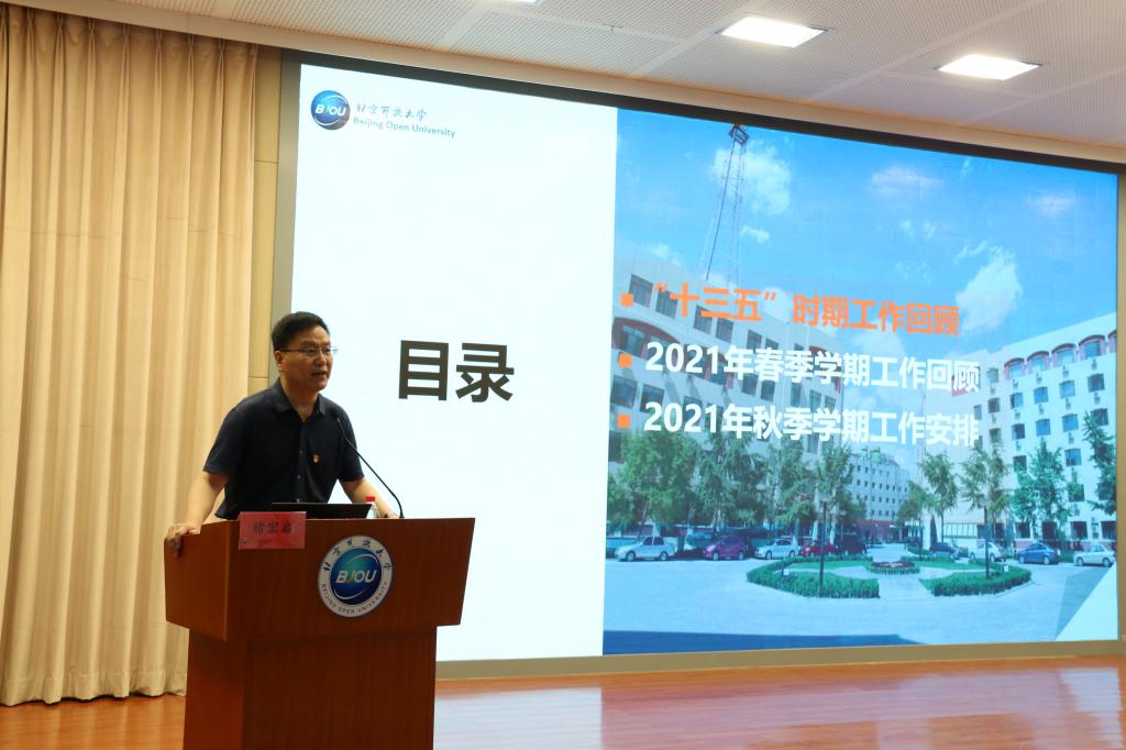 褚宏启指出,“十三五”时期学校加快转型发展,锐意改革创新,办学质量和办学水平全面提升,综合实力和社会影响力有所增强,为“十四五”的发展奠定了坚实基础。在部署新学期工作时,褚宏启强调要全面贯彻落实党的教育方针,加快推进开放教育现代化,推动学校高质量发展,在构建全民终身教育体系和服务学习型城市建设中加快实现不可替代性的基本目标。褚宏启从党建引领和学校治理、招生与系统建设、学历教育与非学历教育、信息化与学分银行建设、科研与国际交流、教师和干部队伍建设、财务工作与后勤服务等九个方面对下半年的重点工作任务、目标要求做了全面部署,要求全体教职工要扎实有效做好本职工作,形成价值共识,同心同德推动学校发展。