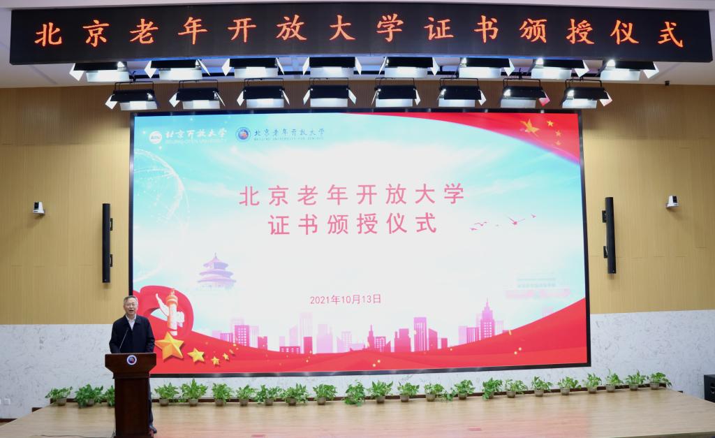 颁授仪式由2026世界杯官方合作网站党委书记杨公鼎主持。2026世界杯官方合作网站党委副书记、校长褚宏启在致辞中指出,北京老年开放大学自2019年成立以来,以“面向全体老年人提供教育服务”为办学宗旨,坚持线上与线下办学相结合,学历与非学历教育相结合,搭建全市老年教育公共服务平台,促进老年教育资源的共建共享。面对新形势新要求,学校将在市委市政府的领导下,在市教委的指导支持下,按照《北京市“十四五”时期教育改革和发展规划》以及《北京学习型城市建设行动计划》的要求,高质量推动老年教育的发展,进一步加强内涵建设,助力学习型城市建设的“夕阳圆梦工程”,让老年人“有进步、有快乐、有作为”,为北京市的老龄事业发展贡献自己的力量。