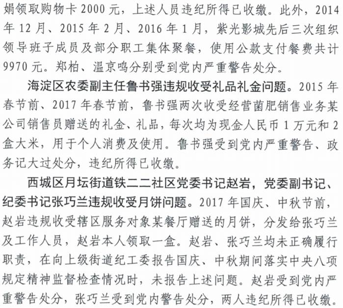 3.北京城建建设工程有限公司党委副书记、原纪委书记刘斌等人接受超标准接待、公款旅游等问题。2017年12月18日至21日,刘斌等一行3人赴该公司成都项目部检查工作。12月19日晚,刘斌等人接受该公司成都项目部的公务接待,违规饮用项目部提供的单价860元的高档白酒共5瓶,饮酒费用通过虚开发票降低单价等方式公款报销。12月20日晚,刘斌等人再次违规接受成都项目部公款宴请。此外,刘斌等人还存在违规使用公车到成都某景区参观游览、报销超标准用餐费用等问题。刘斌受到党内严重警告处分并被免去纪委书记职务。其他相关责任人受到相应处理。