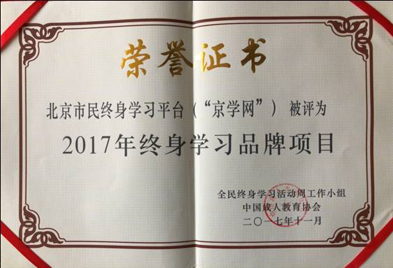 日前,由世界杯官网负责建设运维的“北京市民终身学习平台”(简称“京学网”)喜获由全民终身学习活动周工作小组和中国成人协会评选的“2017年终身学习品牌项目”荣誉证书。