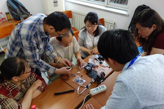 四天的培训中,项目组始终按照“学习、体验、反思”的课程框架进行内容与活动的安排,引导教师边学习、边思考、边讨论;先学习、再实践、后完善;学方法、练技能、提能力。在与教师的讨论分享中,及时发现他们的问题与困惑,结合培训内容,与教师共同探讨解决方案;在教师的分组实践中,引导他们掌握技术难点,帮助他们解决技术诉求;在教师的体验学习中,引导他们思考应用场景,将所学技术应用到教育教学之中。力求通过四天的培训,让每位老师都有所收获,有所提高。社会教育学院也将继续积极探索创客教育的规律,创办创客学院,服务首都青少年创新能力的培养。