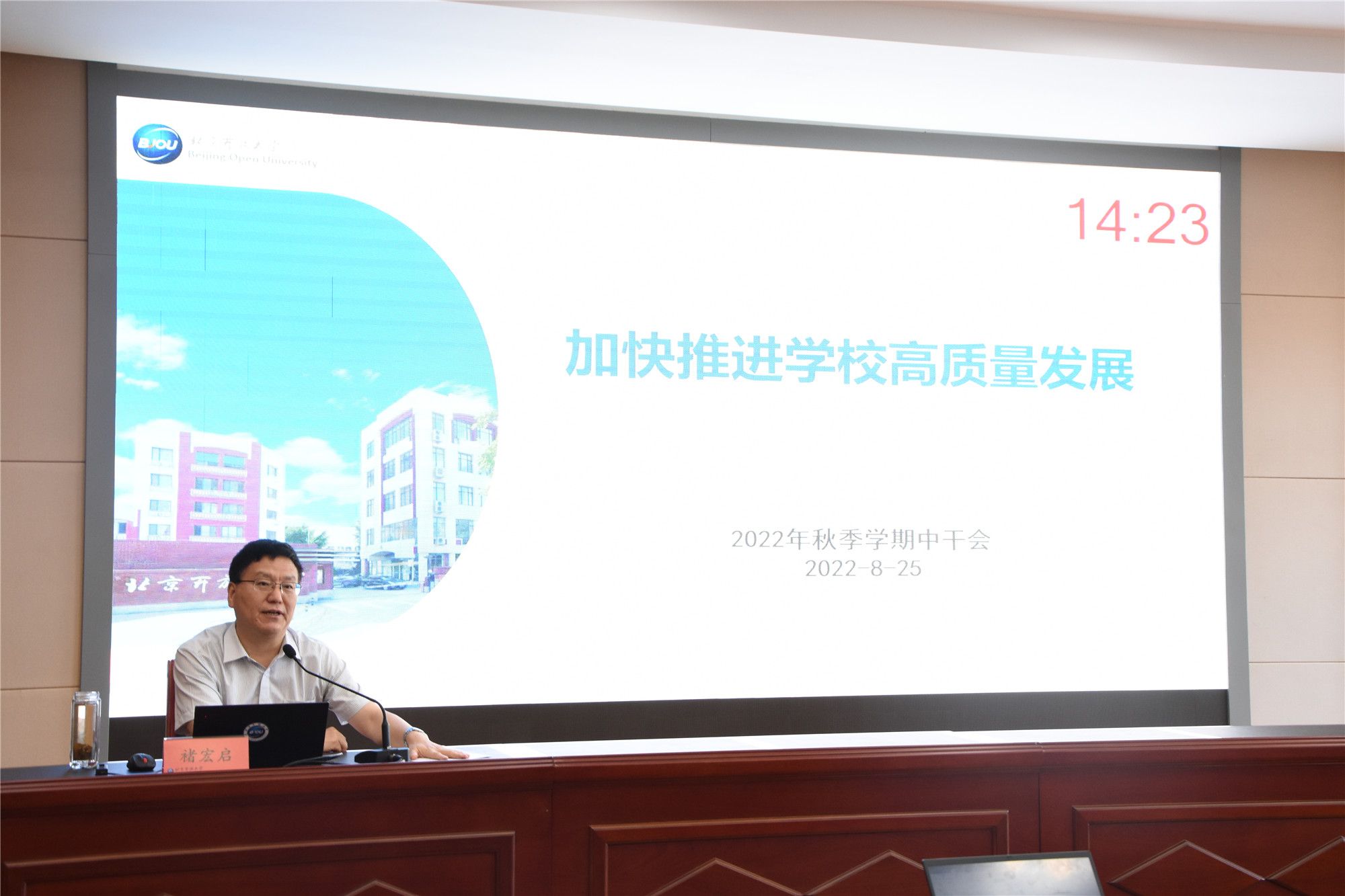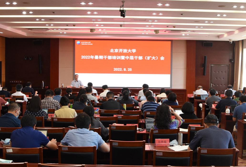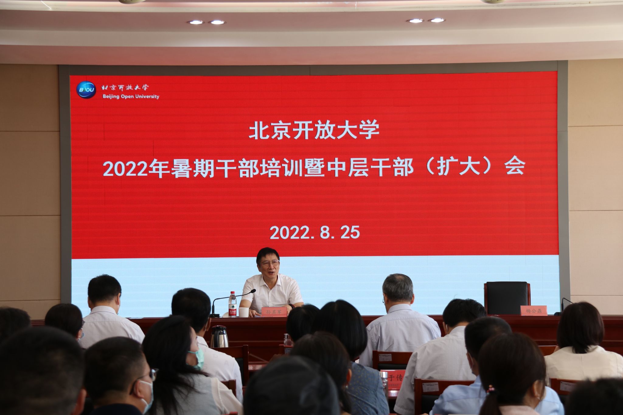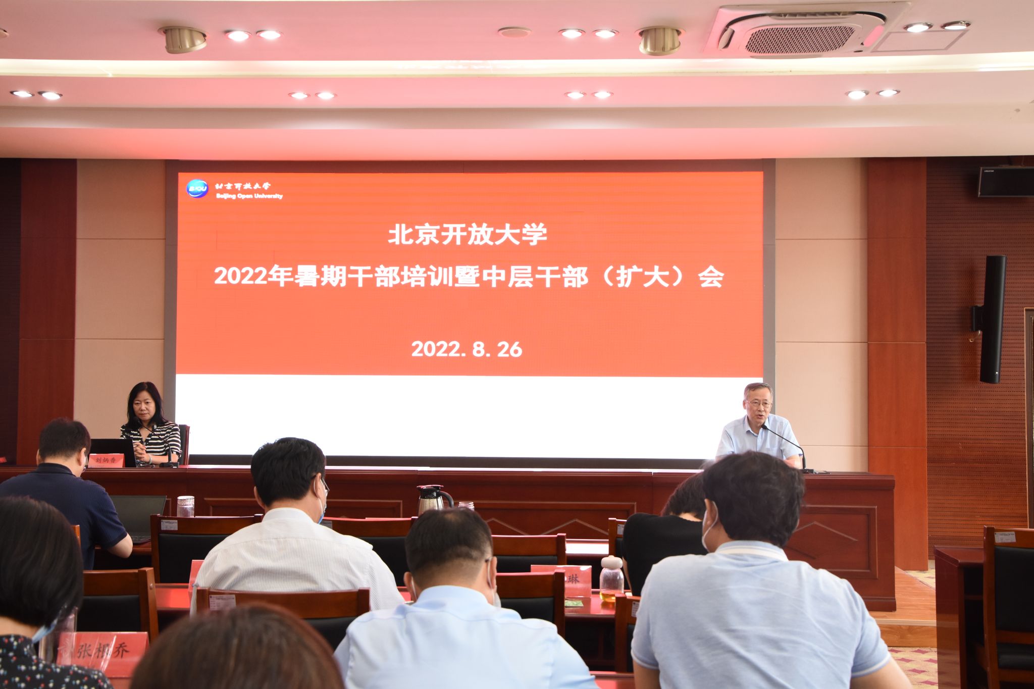 为深入学习落实北京市第十三次党代会精神和市高校暑期工作会议精神,全力推动开放教育高质量发展,以优异成绩迎接党的二十大胜利召开,8月25日和26日学校召开中层干部(扩大)会暨干部培训会。全体校领导,中层干部,教授委员会主任、副主任委员,院长、副院长,部门助理,系主任等80多人参加了培训和会议。会议由校党委副书记、校长褚宏启主持。
