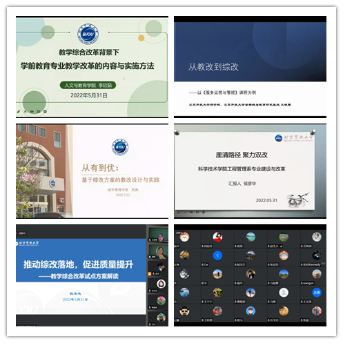 来自各学院和教务处的5位老师围绕“综改背景下如何做好教改项目”进行分享。人文与教育学院教师李欣茹做了题为“综改背景下学前教育专业教学改革的内容与实施方法”的专题发言,她以学前教育专业为例,从学、教、考三个方面介绍了教学改革“一人一案”落实教师发言的主要举措。商学院教师王晓霞做了题为“从综改到教改——以《服务运营与管理》课程为例”的专题发言,通过立足开放大学教师系统化教学设计的工作全景,分享了自己教研的体会与思考。城市管理学院教师高茜做了题为“从有到优:基于综改方案的教改设计与实践”的专题发言,分享了学院层面如何做实教学改革的思考探索与举措机制。科学技术学院教师侯彦华做了题为“厘清路径,聚力双改——科学技术学院工程系专业建设与改革”的专题发言,她详细阐述了综改和教改过程中工科专业改革模式的创新思路与方法路径。教务处副处长周晖做了题为“推动综改落地,促进质量提升——教学综合改革试点方案解读”的专题发言,她结合学校教学综合改革方案,立足学校现状,解读教学综合改革试点方案内容及综改和教改之间的关系。
