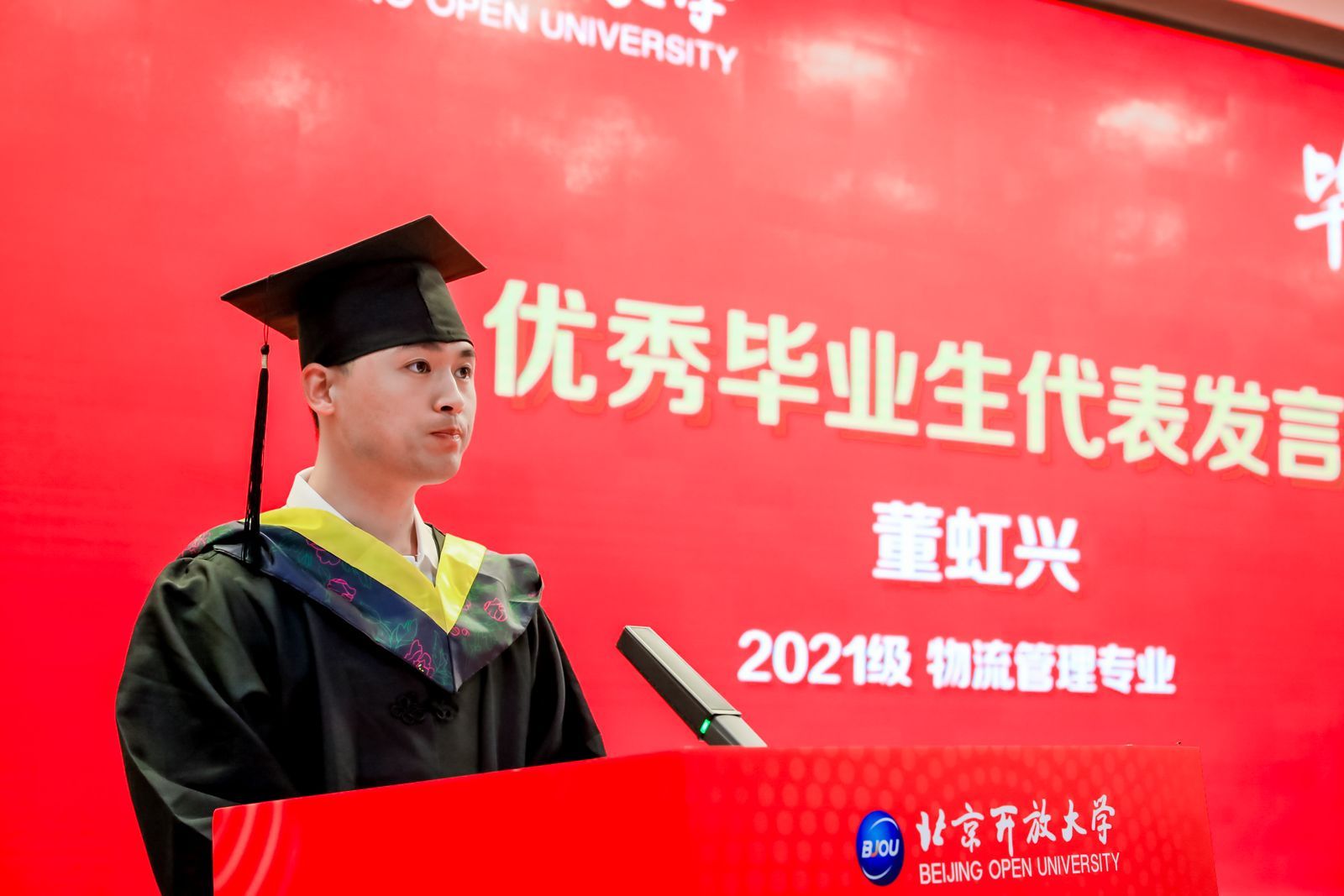 毕业生董虹兴作为学生代表发言。分享了在读期间的收获,表达了对学校祝福。