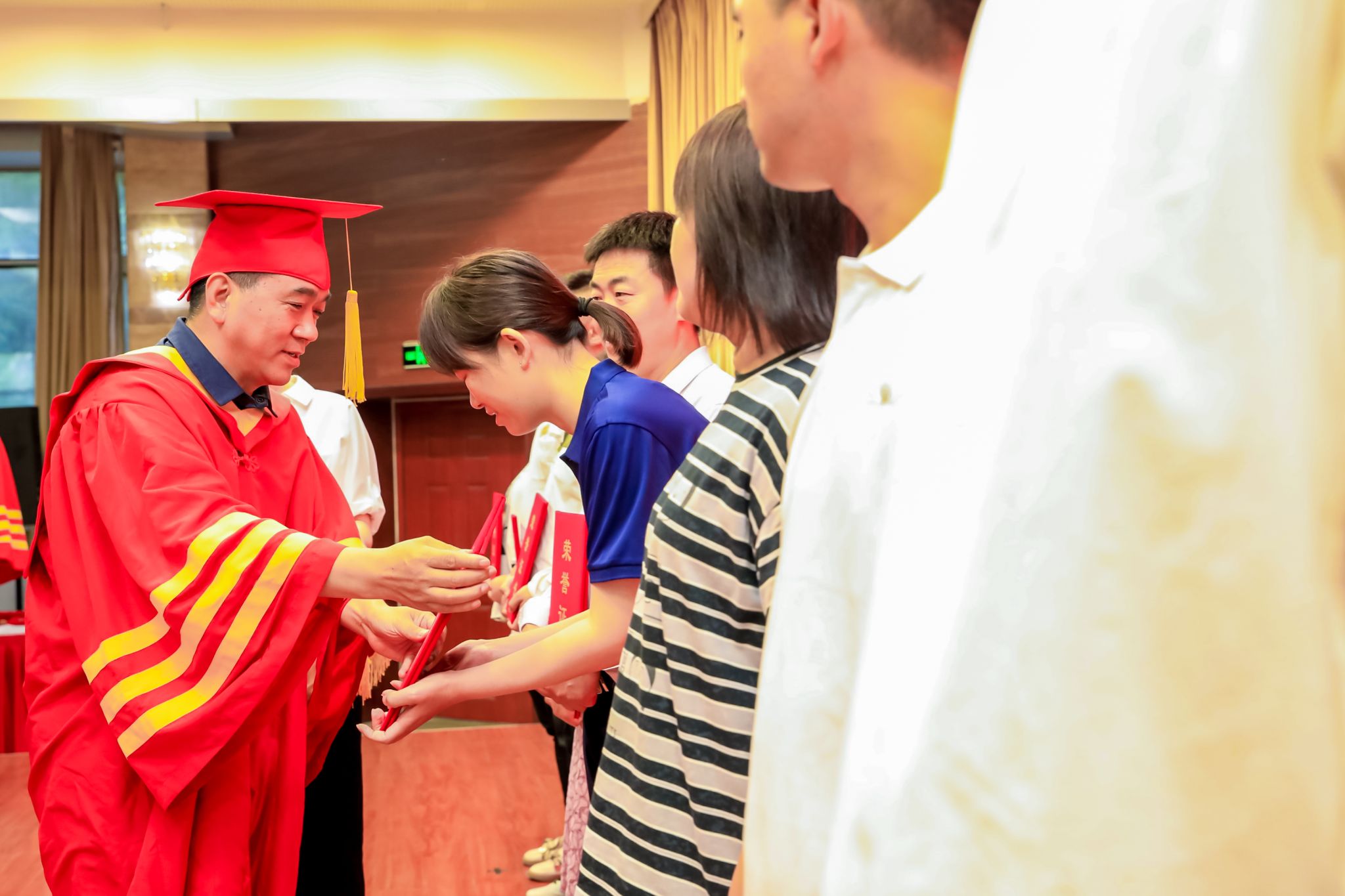 校领导为获得学士学位的学生代表颁发学位证书并拨穗正冠。